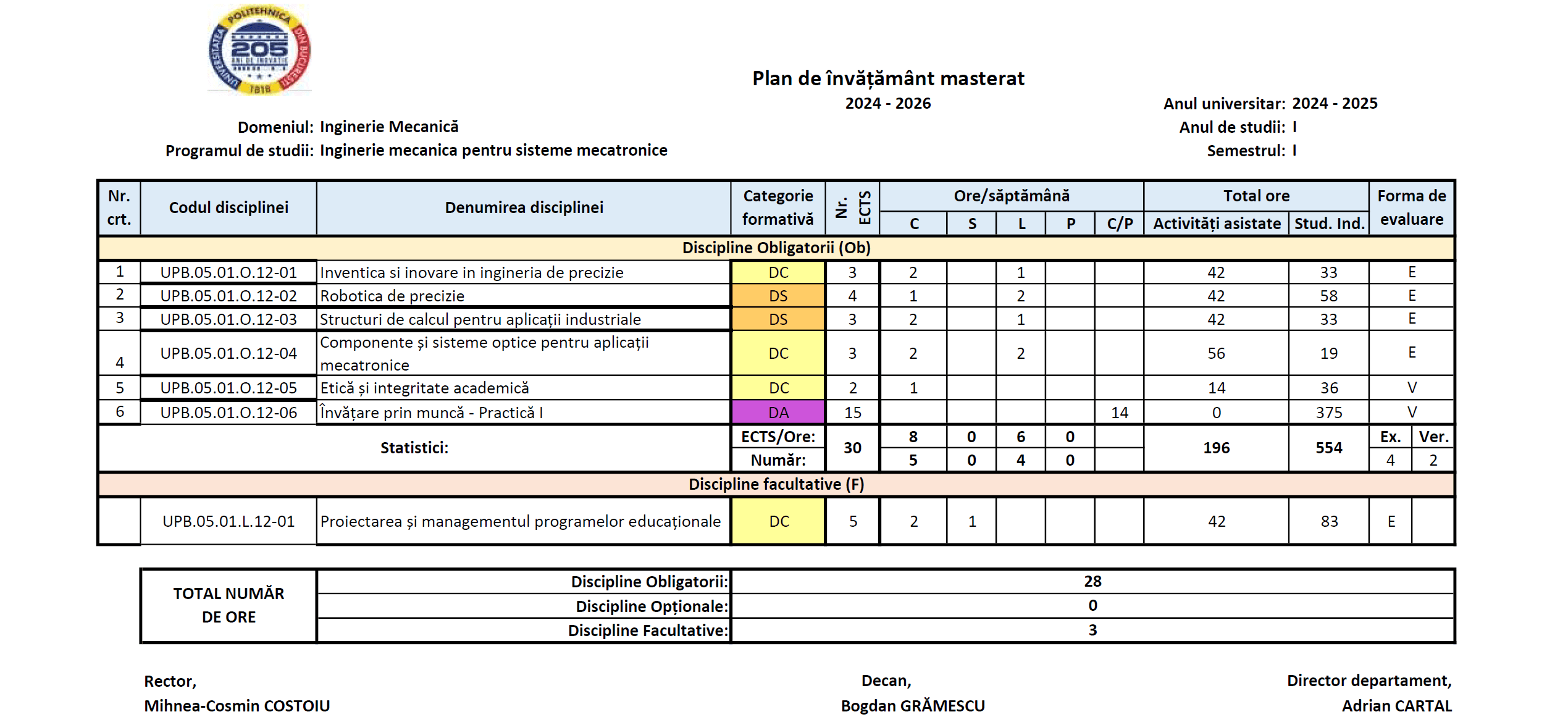 Curriculum: Robotică de precizie, Structuri mecanice pentru sisteme mecatronice, Arhitectura sistemelor de automatizare și control distribuite, Sisteme senzoriale și metrologie avansată, Microsisteme electromecanice și mecatronice și alte materii;
