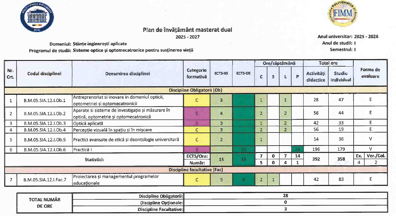 Programul de masterat Sisteme optice și opto-mecatronice pentru susținerea vieții, din domeniul Științe Inginerești Aplicate, este conceput ca program de master dual, încă din etapa de fundamentare, în strânsă corelare cu cerințele mediului socio-economic regional și național. Programul presupune implicarea directă a mediului socio-economic în procesul educațional, prin module de practică, proiecte aplicative, teme de disertație realizate în colaborare cu partenerii industriali și activități desfășurate în contexte reale de producție, cercetare și inovare. Formarea este orientată spre dezvoltarea de competențe avansate în proiectarea, integrarea și exploatarea sistemelor optice și opto-mecatronice utilizate în aplicații pentru susținerea vieții, sănătate, industrie și tehnologii avansate.